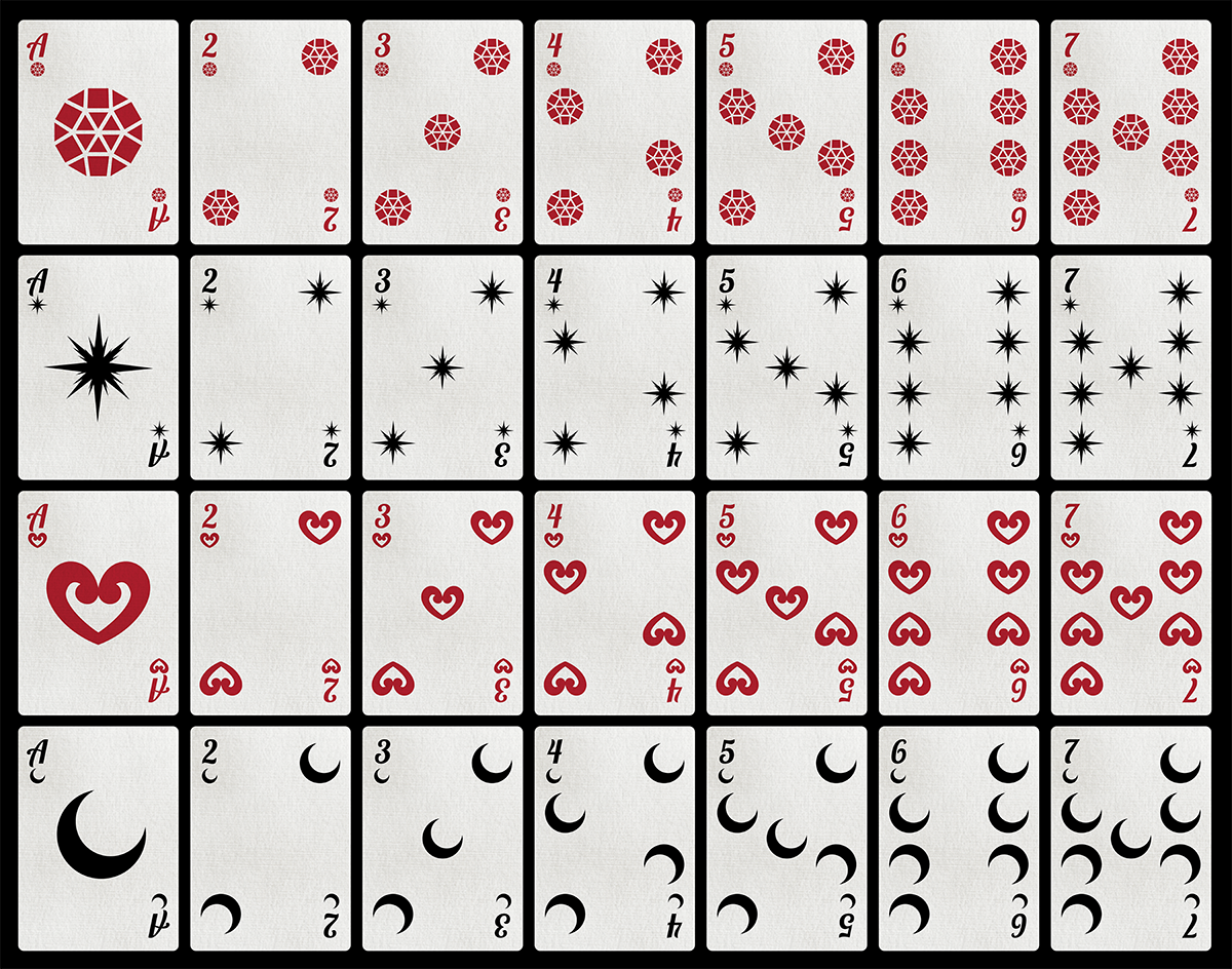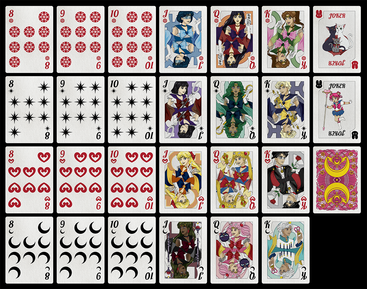 The deck comes with the standard 52 playing cards and 2 Joker cards. The traditional suits have been redesigned to represent four important artifacts in Sailor Moon series; the Crescent Moon in place of Spades, Star Seeds in place of Clubs, Crystals in place of Diamonds, and the Heart Brooch in place of Hearts.